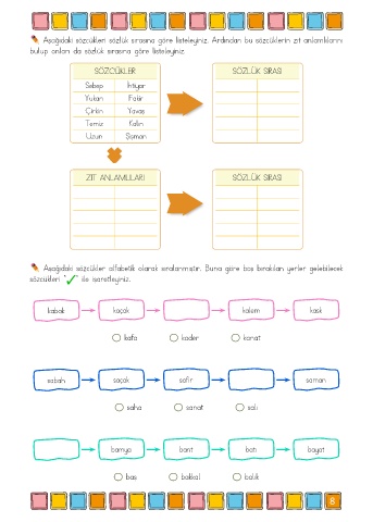 Aşağıdaki sözcükleri sözlük sırasına göre listeleyiniz. Ardından bu sözcüklerin zıt anlamlılarını