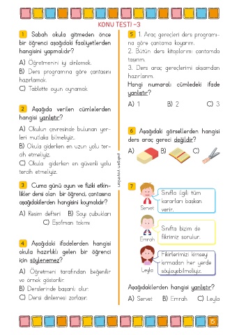 B) Ders programına göre çantasını 3. Ders araç gereçlerimi akşamdan