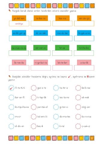 Aşağıda karışık olarak verilen hecelerden anlamlı sözcükler yazınız.