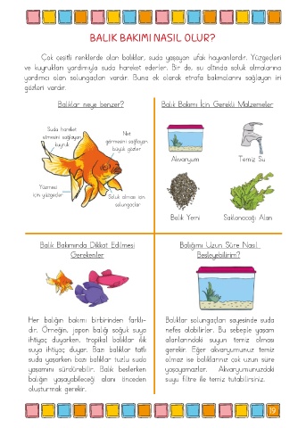 Çok çeşitli renklerde olan balıklar, suda yaşayan ufak hayvanlardır. Yüzgeçleri