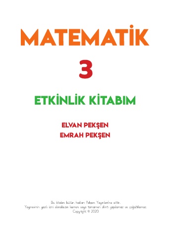 MATEMATİK 3 ETKİNLİK KİTABIM ELVAN PEKŞEN EMRAH PEKŞEN Bu kitabın bütün hakları Pekşen Yayınları’na aittir. Yayınevinin yazılı izni olmaksızın kısmen veya tamamen alıntı yapılamaz ve çoğaltılamaz. Copyright © 2020