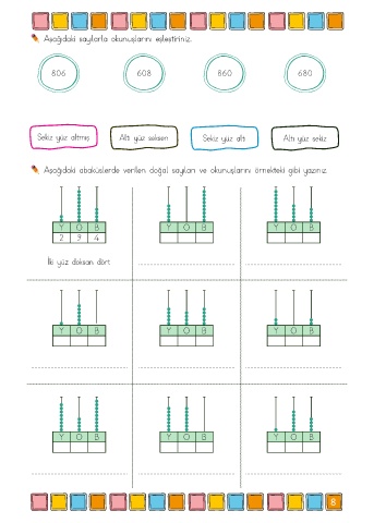 Aşağıdaki abaküslerde verilen doğal sayıları ve okunuşlarını örnekteki gibi yazınız.