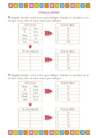 Aşağıdaki sözcükleri, sözlük sırasına göre listeleyiniz. Ardından bu sözcüklerin zıt an-