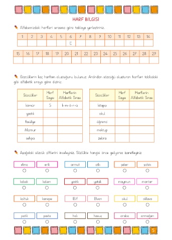 iSözcüklerin kaç harften oluştuğunu bulunuz. Ardından sözcüğü oluşturan harfleri tablodaki