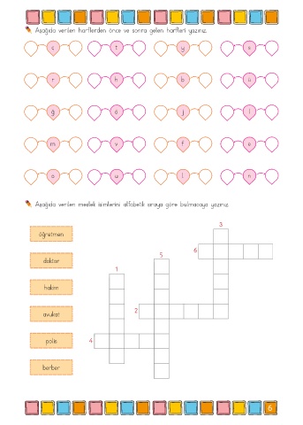 Aşağıda verilen harflerden önce ve sonra gelen harfleri yazınız. ç t y s r h b ü ğ ö j l m v f e o u l n Aşağıda verilen meslek isimlerini alfabetik sıraya göre bulmacaya yazınız. 3 öğretmen 6 5 doktor 1 hakim avukat 2 polis 4 berber 6
