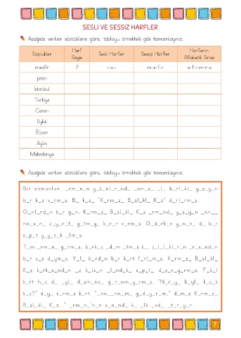 Aşağıda verilen sözcüklere göre, tabloyu örnekteki gibi tamamlayınız.