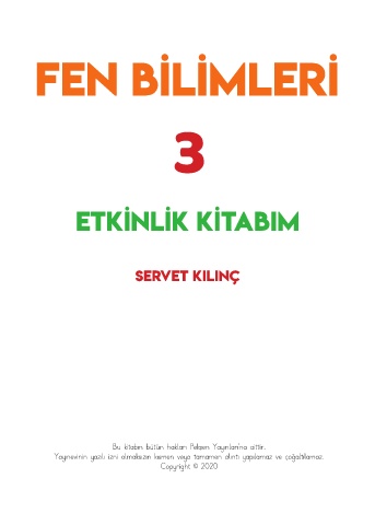 FEN BİLİMLERİ 3 ETKİNLİK KİTABIM SERVET KILINÇ Bu kitabın bütün hakları Pekşen Yayınları’na aittir. Yayınevinin yazılı izni olmaksızın kısmen veya tamamen alıntı yapılamaz ve çoğaltılamaz. Copyright © 2020