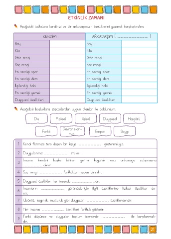 Aşağıdaki tablolara kendinizi ve bir arkadaşımızın özelliklerini yazarak karşılaştıralım.