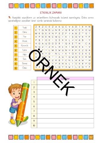 Aşağıdaki sözcüklerin zıt anlamlılarını bulmacada bularak işaretleyiniz. Daha sonra