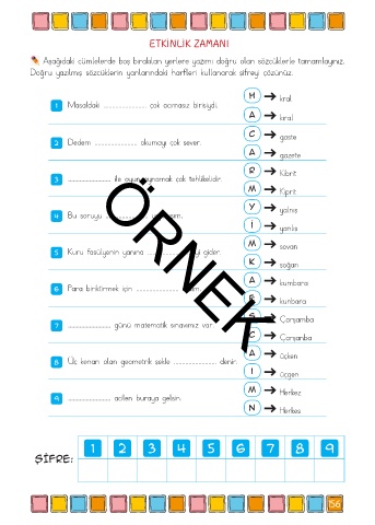Doğru yazılmış sözcüklerin yanlarındaki harfleri kullanarak şifreyi çözünüz.