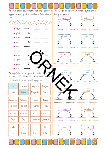 Aşağıdaki sözcüklerin sonuna eklerden Aşağıdaki kökleri ve ekleri ayırıp örnek-