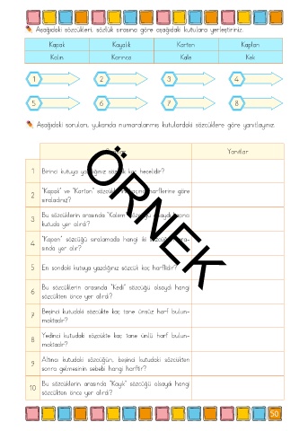 Aşağıdaki sözcükleri, sözlük sırasına göre aşağıdaki kutulara yerleştiriniz.