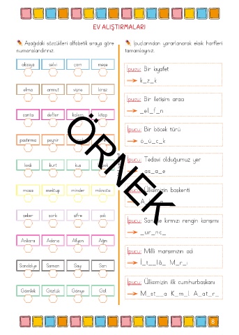 Aşağıdaki sözcükleri alfabetik sıraya göre İpuçlarından yararlanarak eksik harfleri