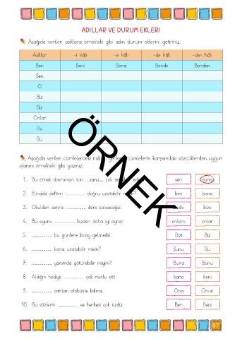 Aşağıda verilen adıllara örnekteki gibi adın durum eklerini getiriniz.
