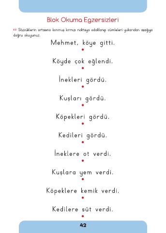+ Sözcüklerin ortasına konmuş kırmızı noktaya odaklanıp cümleleri yukarıdan aşağıya
