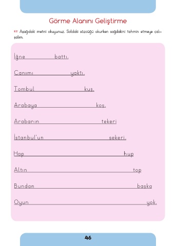 Görme Alanını Geliştirme + Aşağıdaki metni okuyunuz. Soldaki sözcüğü okurken sağdakini tahmin etmeye çalı- şalım. İğne battı. Canımı yaktı. Tombul kuş. Arabaya koş. Arabanın tekeri İstanbul’un şekeri. Hap hup Altın top Bundan başka Oyun yok. 46