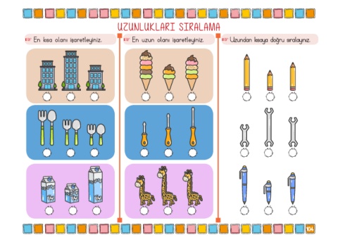 UZUNLUKLARI SIRALAMA + En kısa olanı işaretleyiniz. + En uzun olanı işaretleyiniz. + Uzundan kısaya doğru sıralayınız. 104