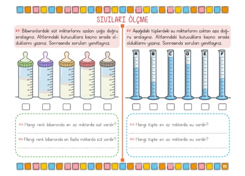 + Biberonlardaki süt miktarlarını azdan çoğa doğru + Aşağıdaki tüplerdeki su miktarlarını çoktan aza doğ-