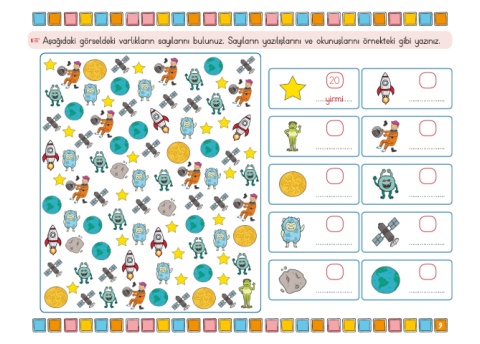 + Aşağıdaki görseldeki varlıkların sayılarını bulunuz. Sayıların yazılışlarını ve okunuşlarını örnekteki gibi yazınız.