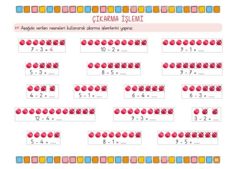 + Aşağıda verilen nesneleri kullanarak çıkarma işlemlerini yapınız.