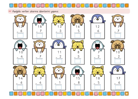 + Aşağıda verilen çıkarma işlemlerini yapınız. 1 3 1 8 13 1 6 12 9 - 6 - 7 - 3 5 6 - 7 10 1 8 1 1 8 7 1 0 - 4 - 7 - 2 - 3 - 2 - 2 14 9 14 15 18 17 - 6 - 4 - 1 - 8 - 5 - 6 38