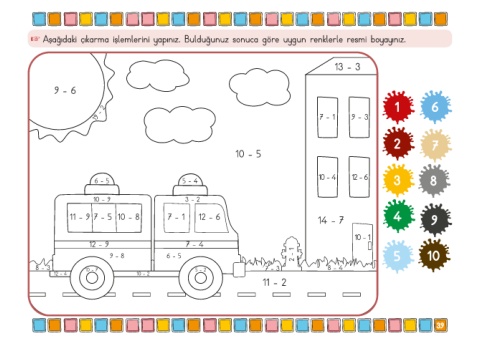 + Aşağıdaki çıkarma işlemlerini yapınız. Bulduğunuz sonuca göre uygun renklerle resmi boyayınız.