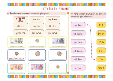 + Paralarımızın isimlerini örnekteki gibi yazınız. + Paralarımızın okunuşları ile isimlerini