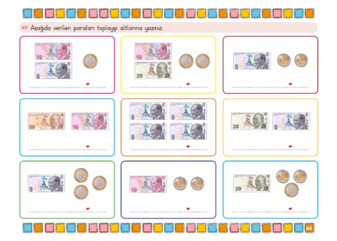 + Aşağıda verilen paraları toplayıp altlarına yazınız.