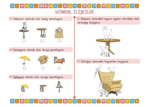 + Sehpanın üstünde olan kediyi işaretleyiniz. + Masanın üstündeki hayvanı siyaha, altındakini kah-