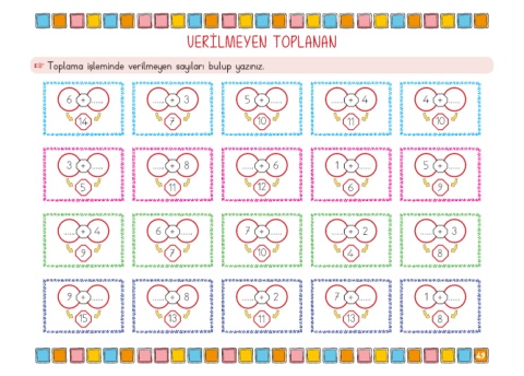 + Toplama işleminde verilmeyen sayıları bulup yazınız.
