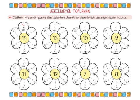 + Çiçeklerin ortalarında yazılmış olan toplamlara ulaşmak için yapraklardaki verilmeyen sayıları bulunuz.