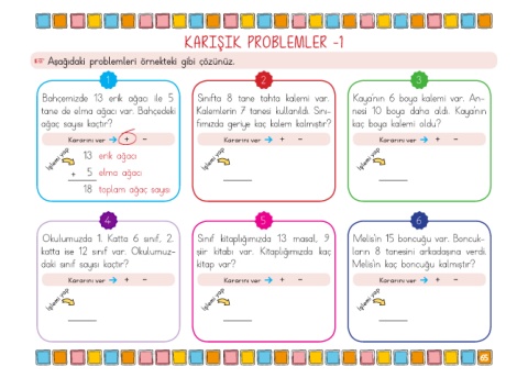 Bahçemizde 13 erik ağacı ile 5 Sınıfta 8 tane tahta kalemi var. Kaya’nın 6 boya kalemi var. An-
