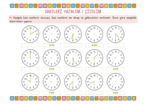 SAATLERİ YAZALIM / ÇİZELİM + Aşağıda bazı saatlerin okunuşu, bazı saatlerin ise akrep ve yelkovanları verilmiştir. Buna göre aşağıdaki alıştırmaları yapınız. 11:30 4:00 9:30 3:30 7:00 8:00 81