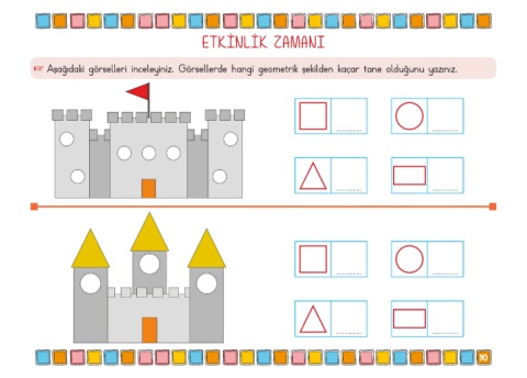 ETKİNLİK ZAMANI + Aşağıdaki görselleri inceleyiniz. Görsellerde hangi geometrik şekilden kaçar tane olduğunu yazınız. ............. ............. ............. ............. ............. ............. ............. ............. 90