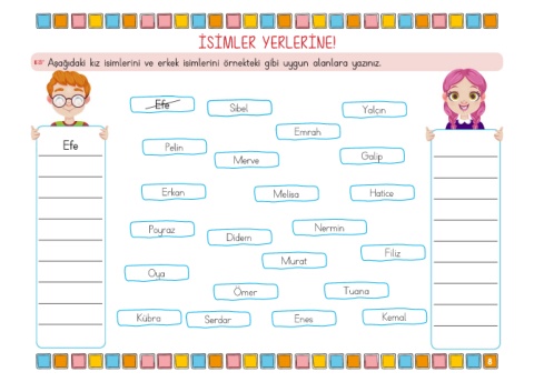 İSİMLER YERLERİNE! + Aşağıdaki kız isimlerini ve erkek isimlerini örnekteki gibi uygun alanlara yazınız. Efe Sibel Yalçın Emrah Efe Pelin Merve Galip Erkan Melisa Hatice Poyraz Nermin Didem Filiz Murat Oya Ömer Tuana Kübra Serdar Enes Kemal 8