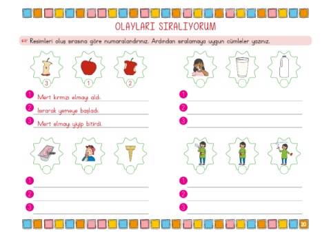 OLAYLARI SIRALIYORUM + Resimleri oluş sırasına göre numaralandırınız. Ardından sıralamaya uygun cümleler yazınız. 3 1 2 2 2 2 1 Mert kırmızı elmayı aldı. 1 2 Isırarak yemeye başladı. 2 3 Mert elmayı yiyip bitirdi. 3 2 2 2 2 2 2 1 1 2 2 3 3 20