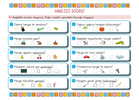 + Aşağıdaki soruları okuyunuz. Doğru cevabın yanındaki kutucuğu boyayınız.