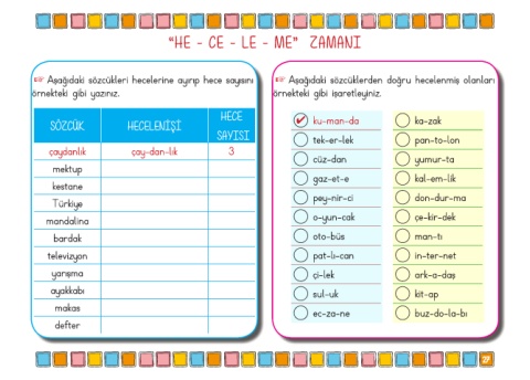 + Aşağıdaki sözcükleri hecelerine ayırıp hece sayısını + Aşağıdaki sözcüklerden doğru hecelenmiş olanları