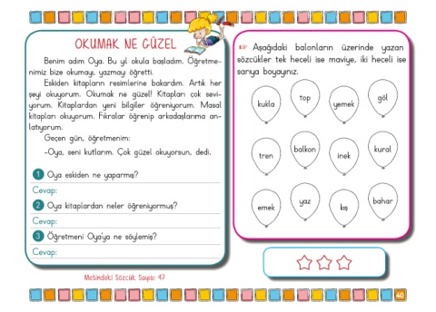 Benim adım Oya. Bu yıl okula başladım. Öğretme- sözcükler tek heceli ise maviye, iki heceli ise