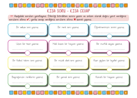 Bir sebze ismi yazınız. Bir renk ismi yazınız. Öğretmeninizin ismini yazınız.