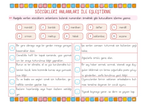 + Aşağıda verilen sözcüklerin anlamlarını bularak numaraları örnekteki gibi kutucukların içlerine yazınız.