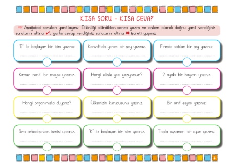 Kırmızı renkli bir meyve yazınız. Hangi elinle yazı yazıyorsun? 2 ayaklı bir hayvan yazınız.