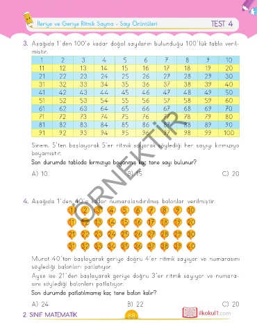 İleriye ve Geriye Ritmik Sayma - Sayı Örüntüleri TEST 4