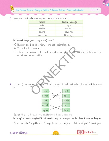 Tek Başına Anlamı Olmayan Kelime / Birleşik Kelime / Yabancı Kelimeler TEST 5