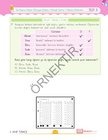 7. Aşağıda birleşik kelimelerle ilgili doğru yanlış tablosu verilmiştir. Öğrenciler