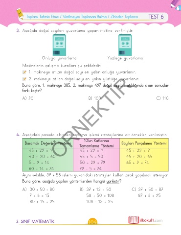 Toplamı Tahmin Etme / Verilmeyen Toplananı Bulma / Zihinden Toplama TEST 6