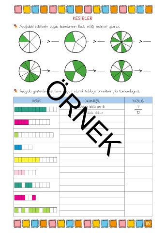 KESİRLER Aşağıdaki şekillerin boyalı kısımlarının ifade ettiği kesirleri yazınız. Aşağıda gösterilen şekillere uygun olarak tabloyu örnekteki gibi tamamlayınız. KESİR OKUNUŞU YAZILIŞI Dokuz bölü on iki 9 On ikide dokuz 12 ÖRNEK 115