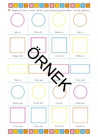 Aşağıda okunuşları verilen kesirleri uygun boyama yaparak şekiller üzerinde gösteriniz.