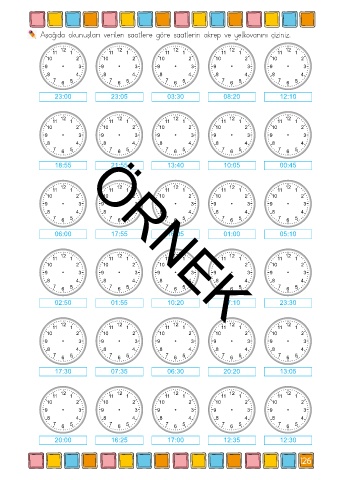 Aşağıda okunuşları verilen saatlere göre saatlerin akrep ve yelkovanını çiziniz.