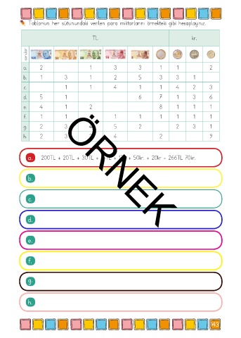 Tablonun her sütunundaki verilen para miktarlarını örnekteki gibi hesaplayınız.